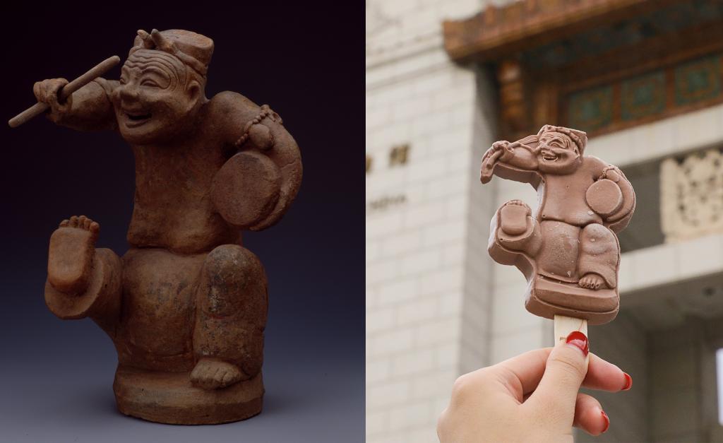 近年来,中国国家博物馆以藏品及展览为主题,开发饮食文创,借食品传递传统文化背后的美好寓意,讲述文物蕴藏的历史故事,让国博文物走进大众生活。左图为东汉击鼓说唱俑,右图为巧克力说唱俑雪糕(2022年5月14日,资料照片)。