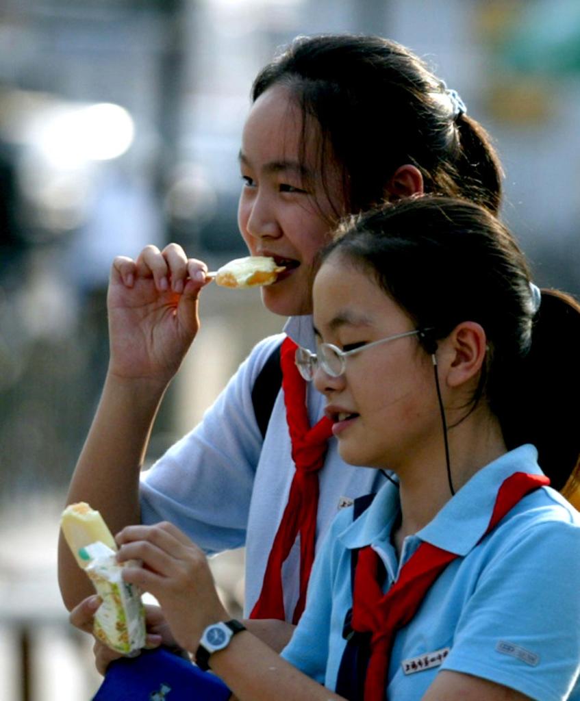 2002年9月2日,两位初中生在上海徐家汇广场边走边吃雪糕。