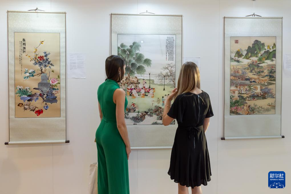 6月13日,在匈牙利布达佩斯,人们在2024年布达佩斯中国旅游文化周暨首届中国非遗旅游文创展开幕式后参观展览。新华社发(弗尔季·奥蒂洛摄)