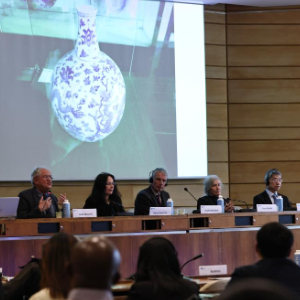 4月15日,在位于法国巴黎的联合国教科文组织总部举行的“文明交流互鉴理念国际研讨会”上,中外嘉宾参加“丝绸之路:人类文化交流的璀璨乐章”分组讨论。新华社记者高静摄
