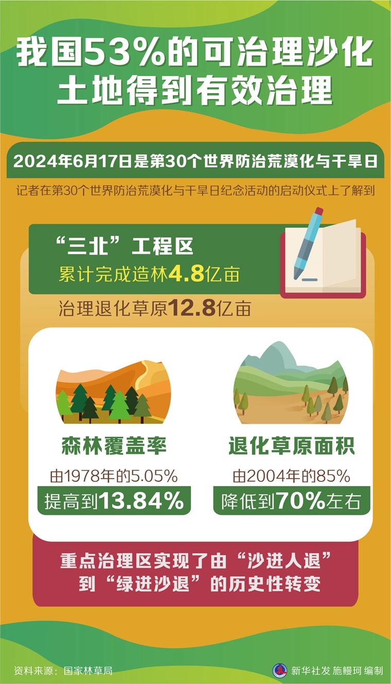 加强荒漠化防治,关系到我国生态安全。国家林草局有关负责人6月15日表示,我国高度重视荒漠化防治工作,特别是党的十八大以来,持续加大“三北”等重点生态工程建设力度,推进科学化、规模化治沙,53%的可治理沙化土地得到有效治理。