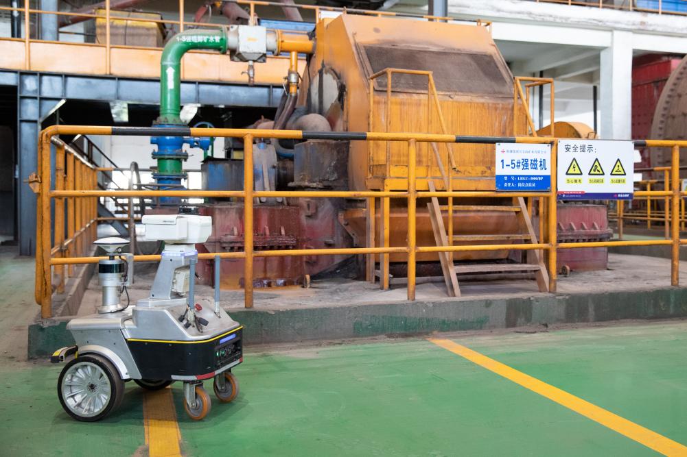 生产现场无人化,依靠什么来实现?步入磨磁车间,巨大的轰鸣声在这个长约100米、宽约50米、高约30米的厂房内回响。登上二楼作业平台,两台直径6.2米的大型球磨机上的转轮正在飞速旋转。不远处,磨磁巡检机器人闪烁着灯光,正在采集设备温度、振动等状态数据。