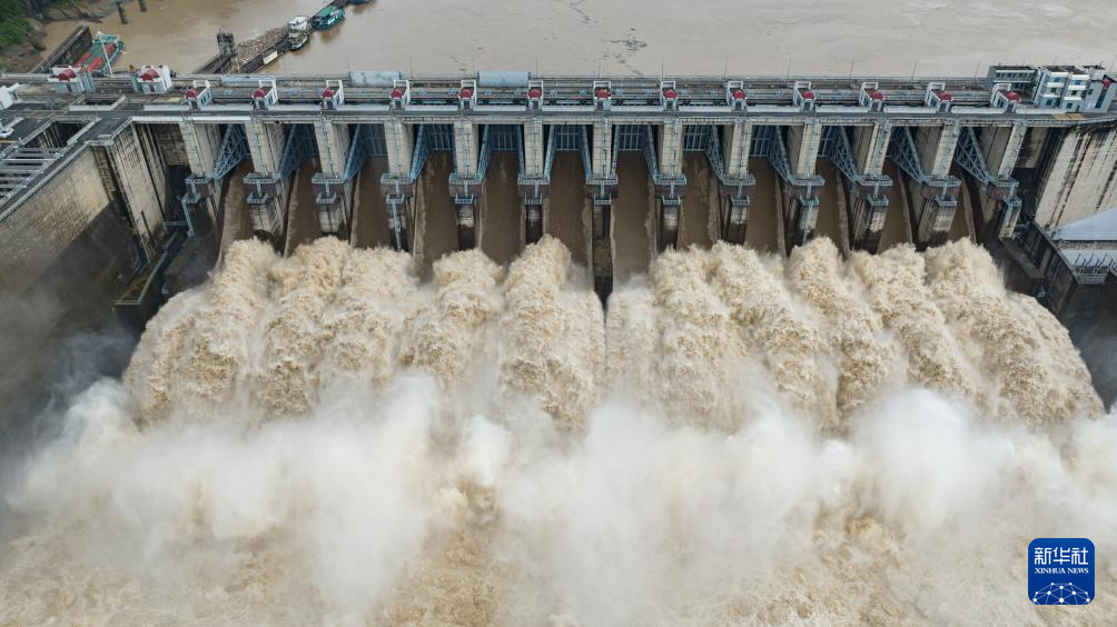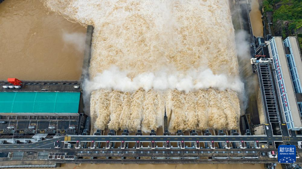 6月16日,水口水电站12扇闸门全部开启泄洪(无人机照片)。新华社记者 周义 摄