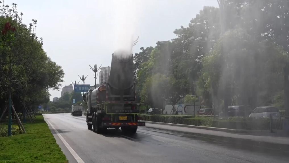 在河南省鹤壁市,雾炮车、洒水车正在开展湿扫、洒水、冲洗组合作业,进行防尘降温。