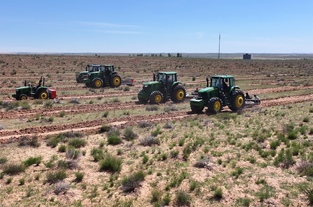 在地处库布其沙漠腹地的鄂尔多斯市杭锦旗防沙治沙项目区,5台牵引播种机在沙地里往来穿梭,挖沟、栽柠条、掩土等作业一气呵成。