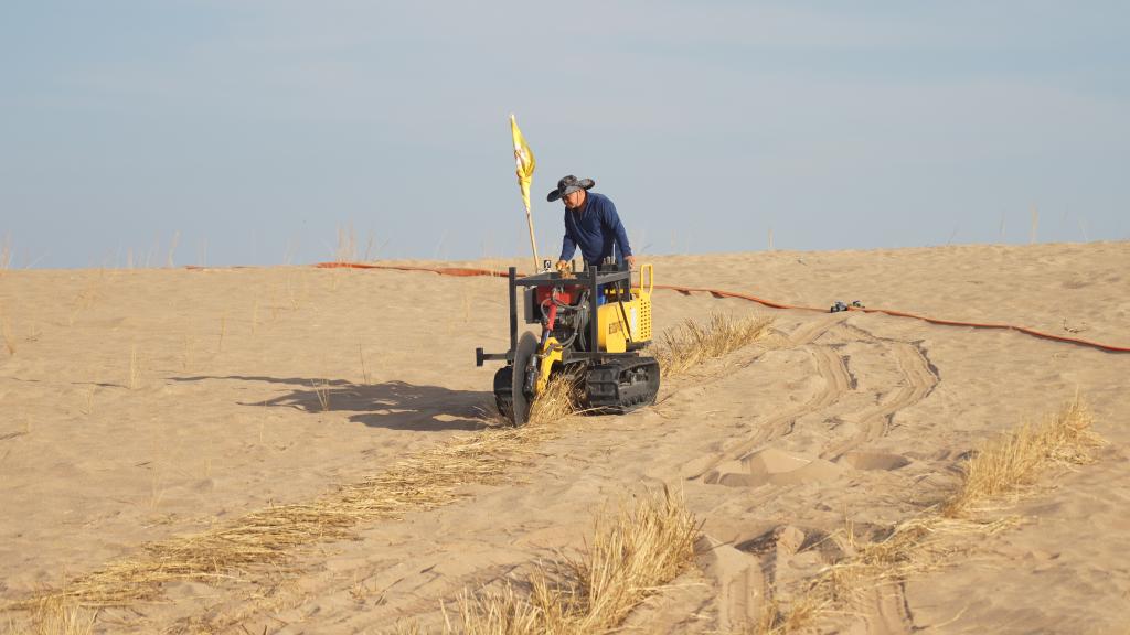 据内蒙古林草局副局长陈永泉介绍,按照防沙治沙工作需求,内蒙古陆续研发和引进、推广使用压制沙障机、灌草种子喷播一体机等适用范围广、工作效率高的防沙治沙机械装备,治沙方式已由过去的“人海战术”向现在的“机械会战”转变,有效提升生态工程质量和效率。