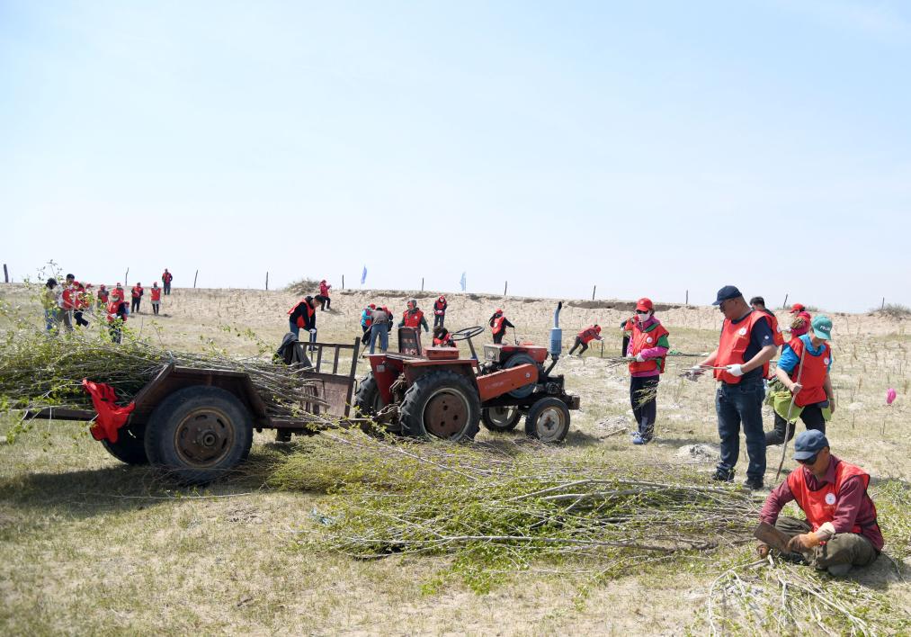 2024年5月6日,在地处浑善达克沙地的内蒙古锡林郭勒盟正蓝旗宝绍岱苏木扎鲁特嘎查,志愿者们开展植绿活动。新华社发(巴依斯古楞 摄)