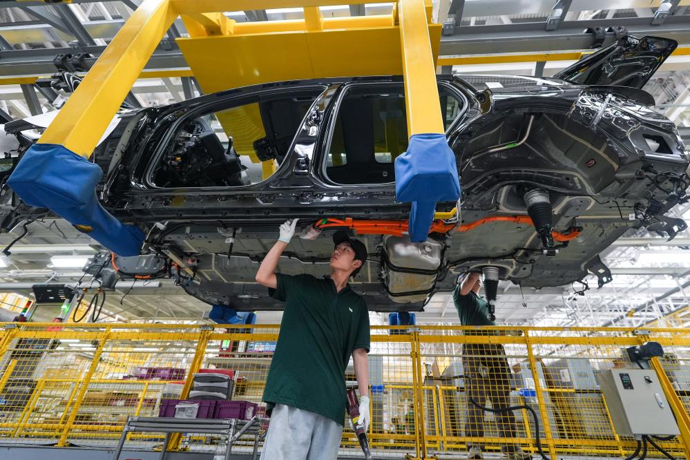 6月14日,工作人员在位于常州市武进区的江苏常州理想汽车智能制造基地总装车间工作。新华社记者李博摄