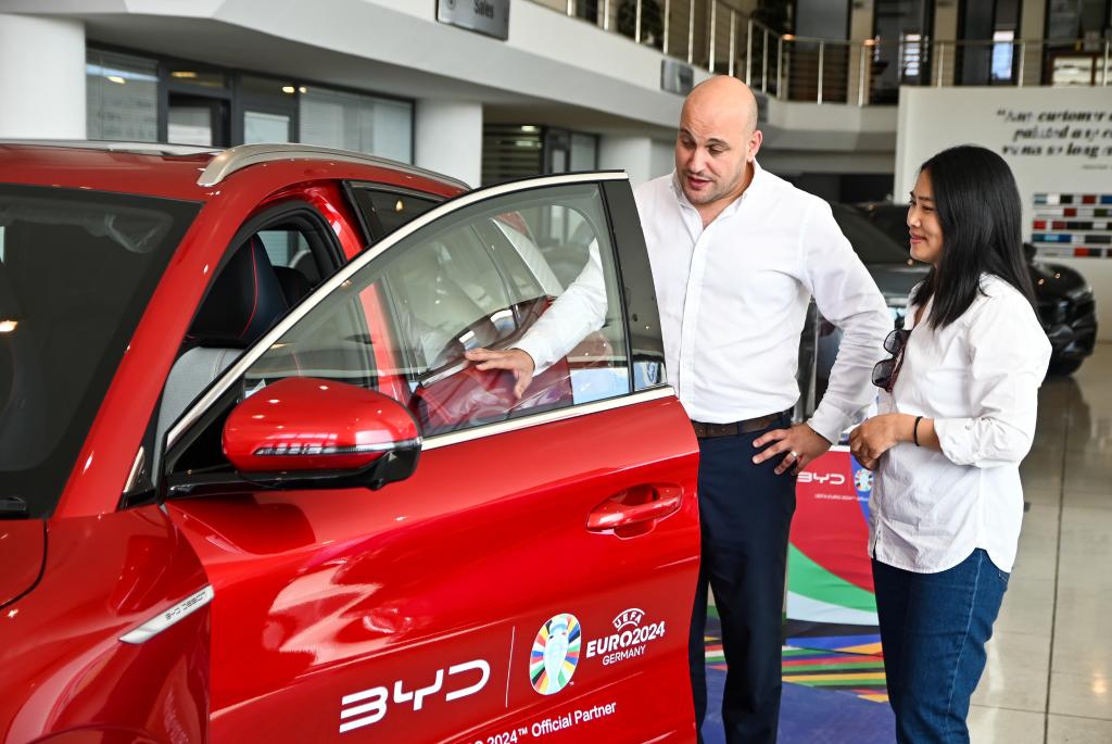 5月29日,在马耳他比尔基卡拉,哈桑-扎米特汽车公司首席执行官德古阿拉(左)介绍一辆比亚迪纯电动汽车。新华社发(乔纳森·博格摄)