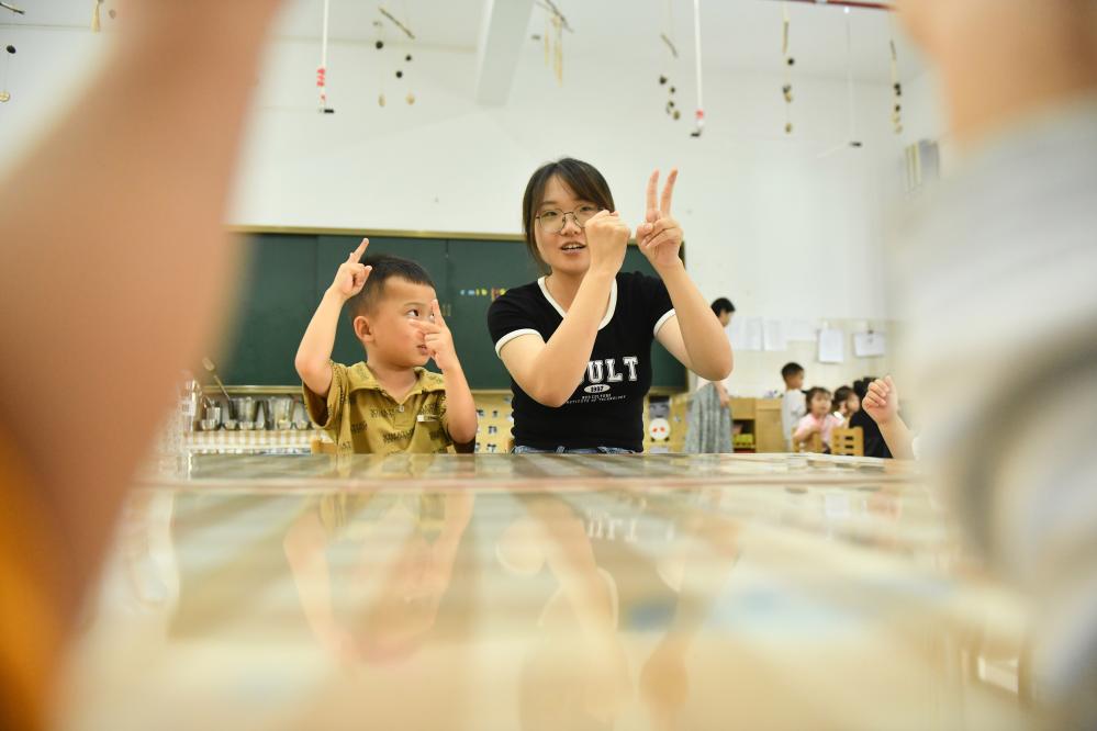 在文秀幼儿园,支教老师宋欣怡带着小朋友玩游戏(6月11日摄)。