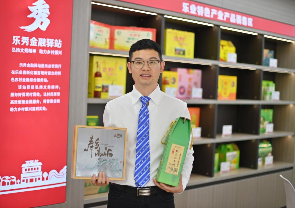 在百坭村农村金融服务站,36岁的宋儒乾展示村里的特色产品(6月11日摄)。两年前,宋儒乾来到百坭村,为村民提供“金融+电商”服务。