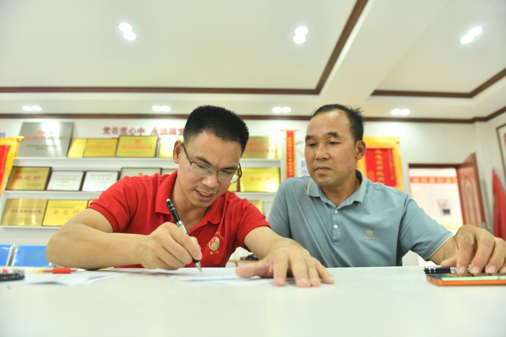 在百坭村村委办公室,34岁的驻村第一书记农俊海(左)为村民办事(6月11日摄)。