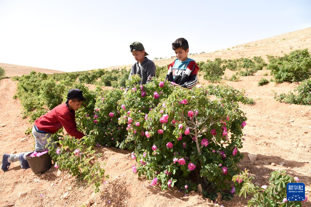 5月28日,在叙利亚大马士革农村省马拉哈镇,儿童们采摘大马士革玫瑰。新华社发(蒙塞夫·梅马里摄)