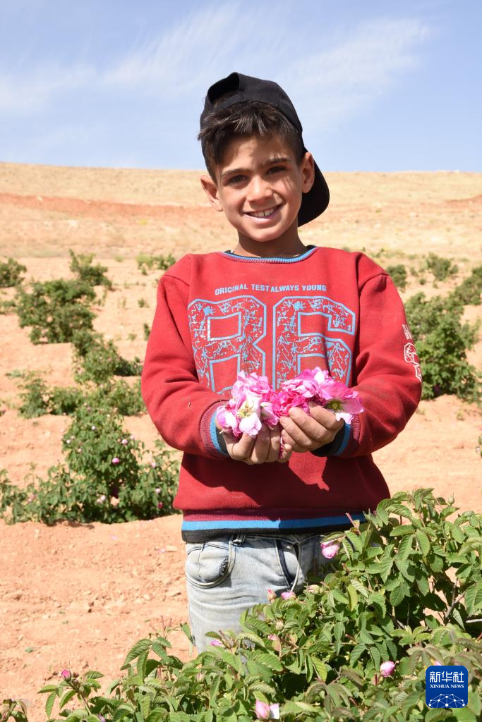 5月28日,在叙利亚大马士革农村省马拉哈镇,一名儿童采摘大马士革玫瑰。新华社发(蒙塞夫·梅马里摄)