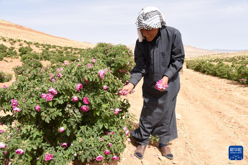 5月28日,在叙利亚大马士革农村省马拉哈镇,穆罕默德·阿巴斯采摘大马士革玫瑰。新华社发(蒙塞夫·梅马里摄)