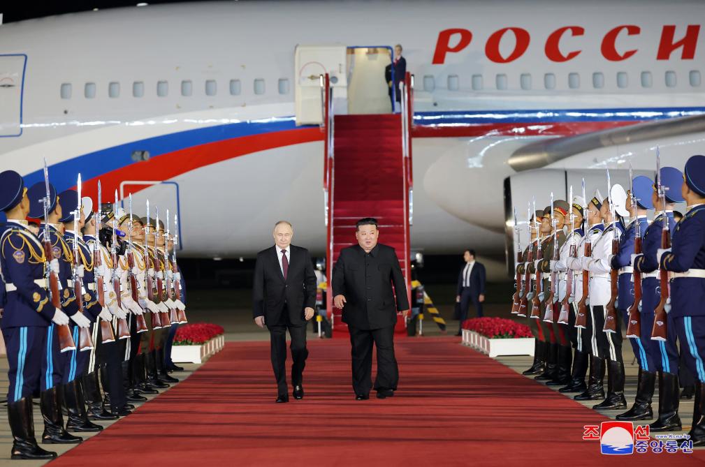6月19日,朝鲜劳动党总书记、国务委员长金正恩(中右)在平壤国际机场迎接俄罗斯总统普京到访。新华社/朝中社