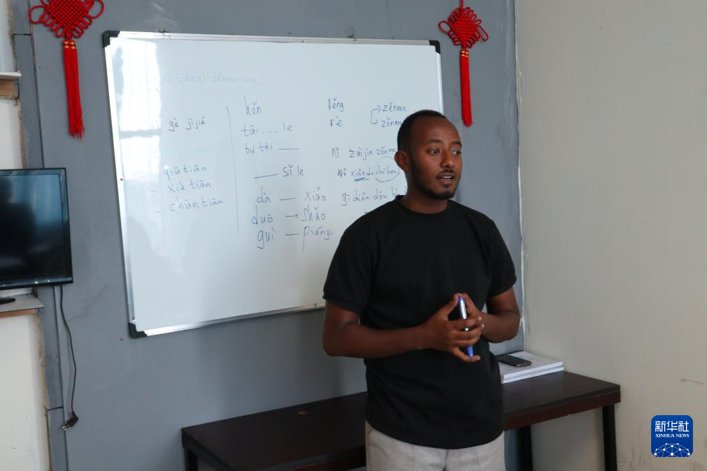 27岁的卡利布·泽拉莱姆是这里的中文教师。2017年至2021年,他曾在中国的湖北师范大学留学,掌握了一口流利的中文。学成归来后,他发现埃塞有不少中国企业,两国各领域交流热络,埃塞民众中文学习需求旺盛,于是创办了中文培训机构——你好Habesha。在当地语言中,“Habesha”意为“埃塞俄比亚人”。