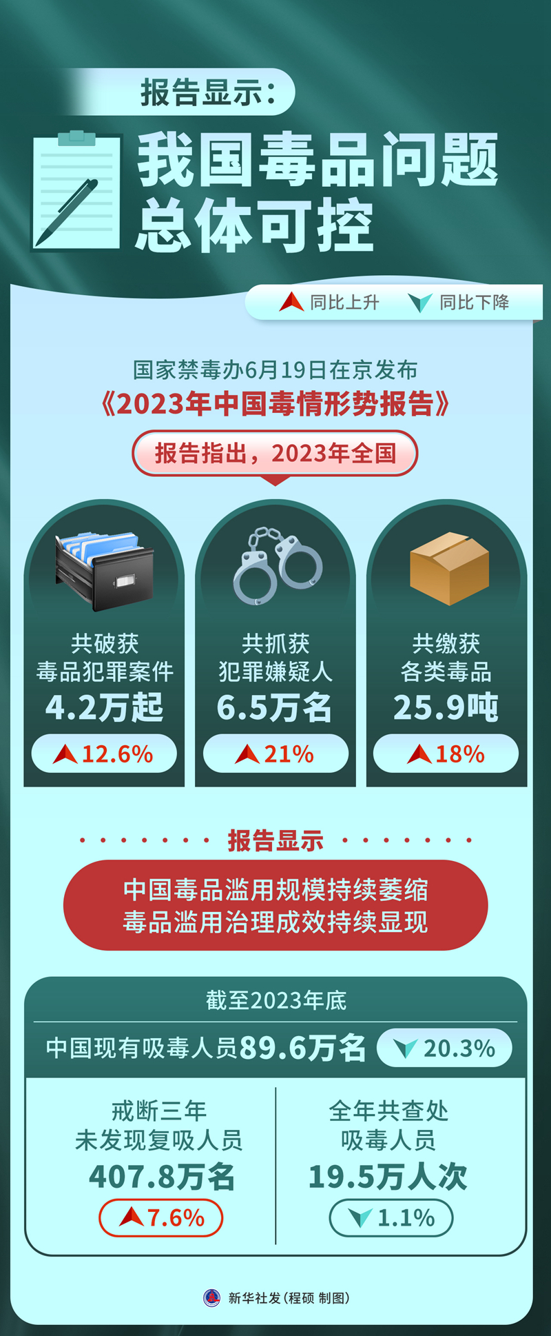 新华社北京6月19日电(记者任沁沁、熊丰)国家禁毒办19日在京发布《2023年中国毒情形势报告》。报告指出,2023年,中国禁毒部门大力整治突出毒品问题,全力防控毒品问题反弹风险,毒品问题总体可控。全国共破获毒品犯罪案件4.2万起,抓获犯罪嫌疑人6.5万名,缴获各类毒品25.9吨,同比分别上升12.6%、21%、18%。