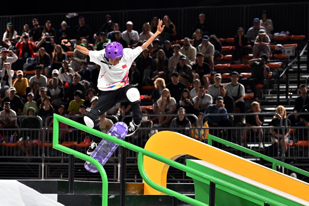 ↑5月18日,中国选手崔宸曦在半决赛大招环节中。当日,巴黎奥运会资格系列赛上海站滑板女子街式半决赛举行。