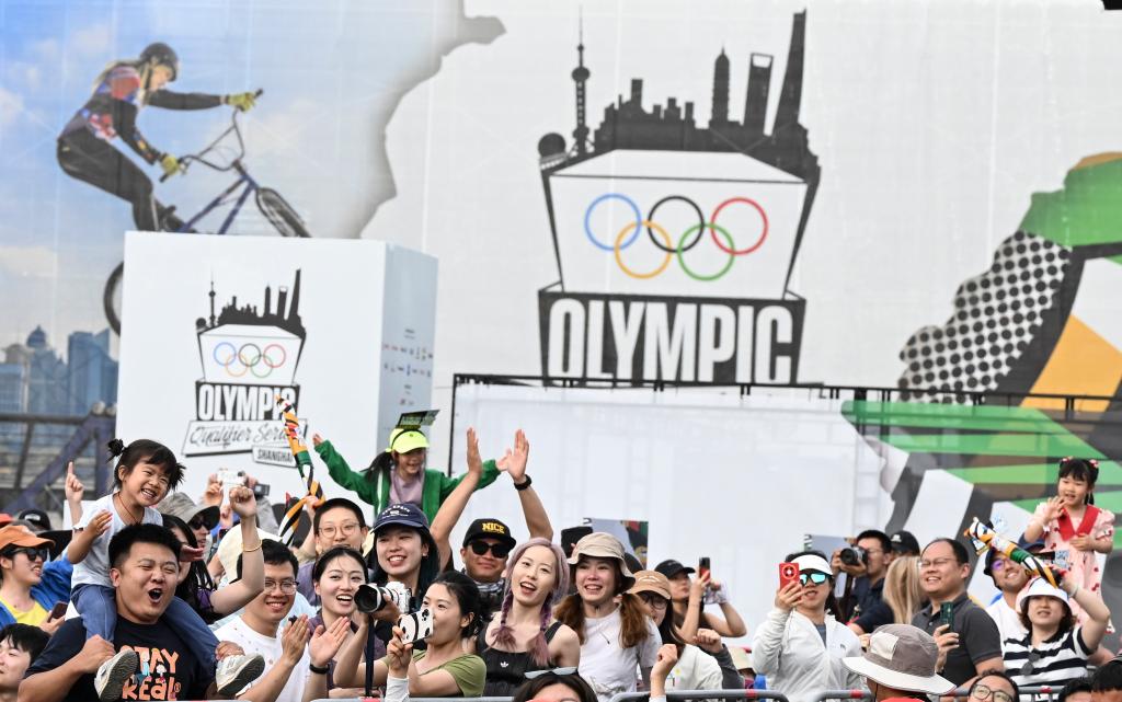 ↑5月16日,观众在城市体育节活动中与巴黎奥运会和残奥会吉祥物合影。当日,巴黎奥运会资格系列赛上海站开启首日赛事。