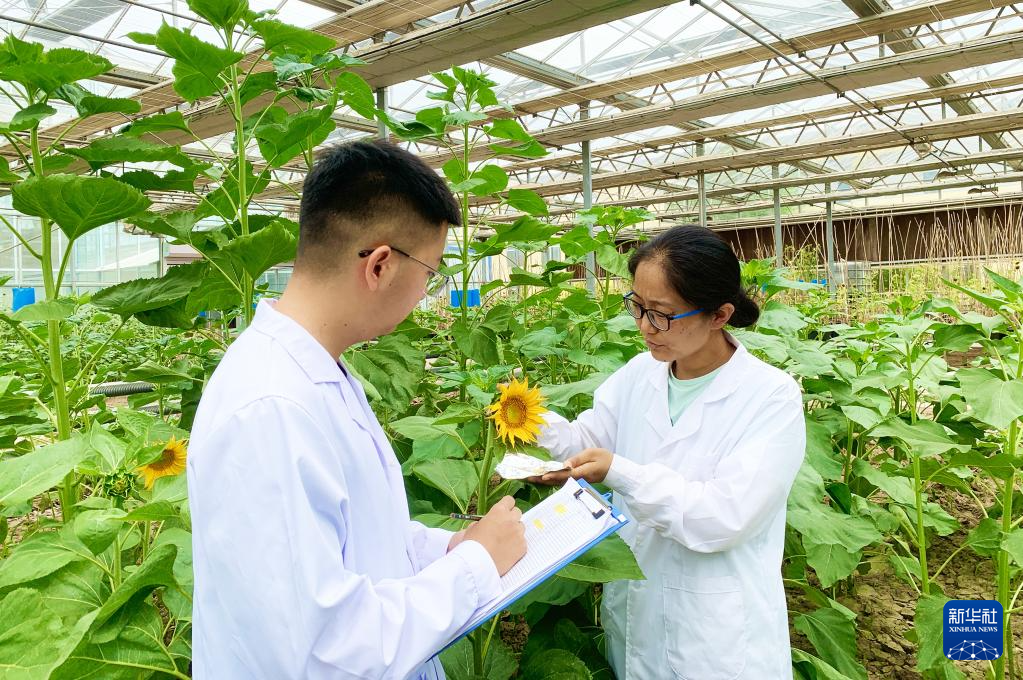 6月14日,在内蒙古巴彦淖尔市五原县,三瑞农科向日葵技术研究院科研人员在观察向日葵抗病害情况。新华社记者 李云平 摄