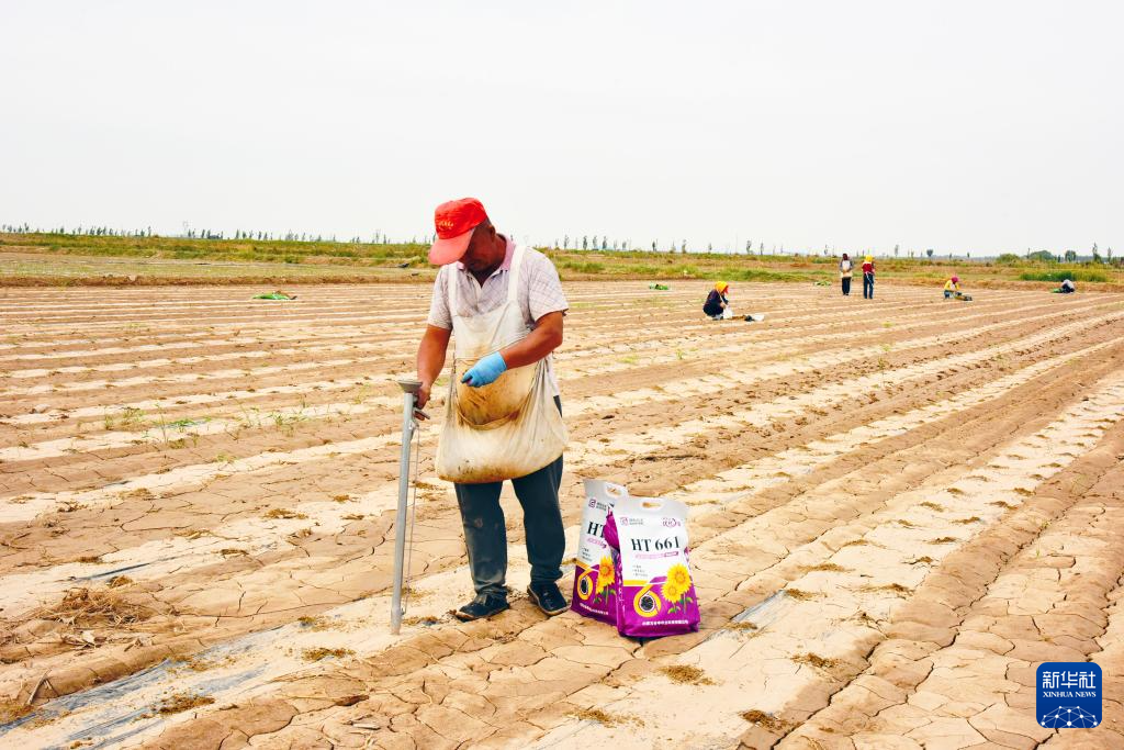 6月6日,内蒙古巴彦淖尔市临河区狼山镇农户在种植向日葵。新华社记者 李云平 摄