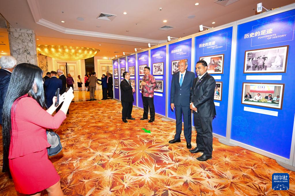 6月19日,在马来西亚首都吉隆坡举行的中马建交50周年图片展上,马中友好协会会长马吉德(右二)在有关马中友好协会的历史照片旁留影。新华社记者 朱炜 摄