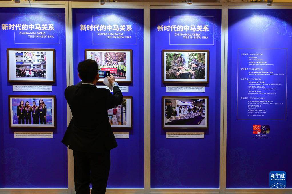 6月19日,一名男子在马来西亚首都吉隆坡观看中马建交50周年图片展。新华社记者 朱炜 摄