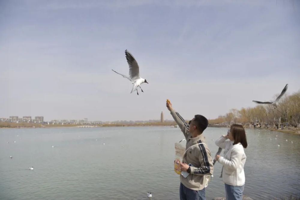市民在银川市海宝公园观赏红嘴鸥。新华社记者 毛竹 摄