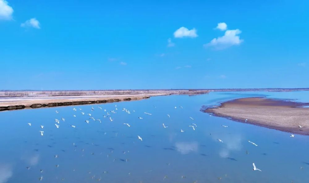 在黄河宁夏段,候鸟在滩涂上空飞翔(无人机照片)。新华社记者 王鹏 摄