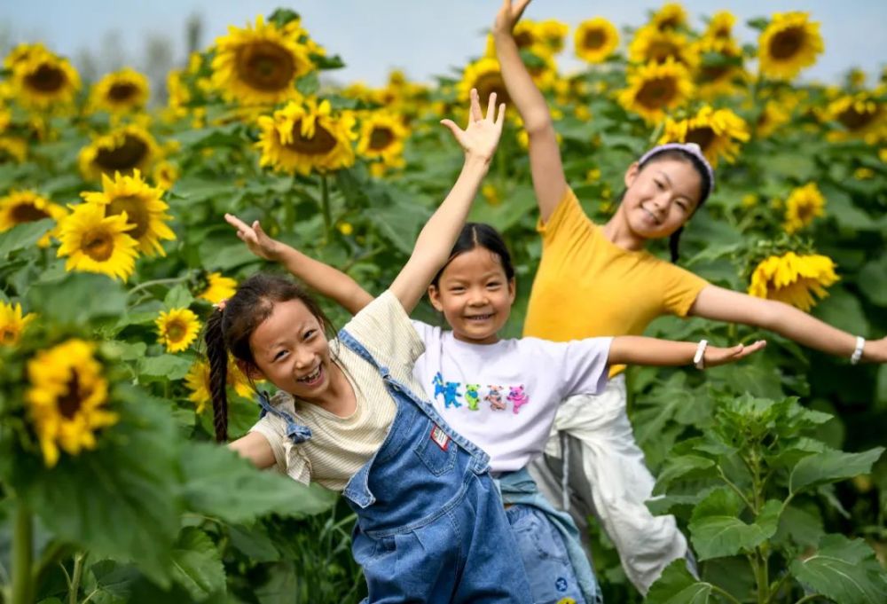 小朋友在镇北堡镇德林村的向日葵花丛中留影。新华社记者 冯开华 摄