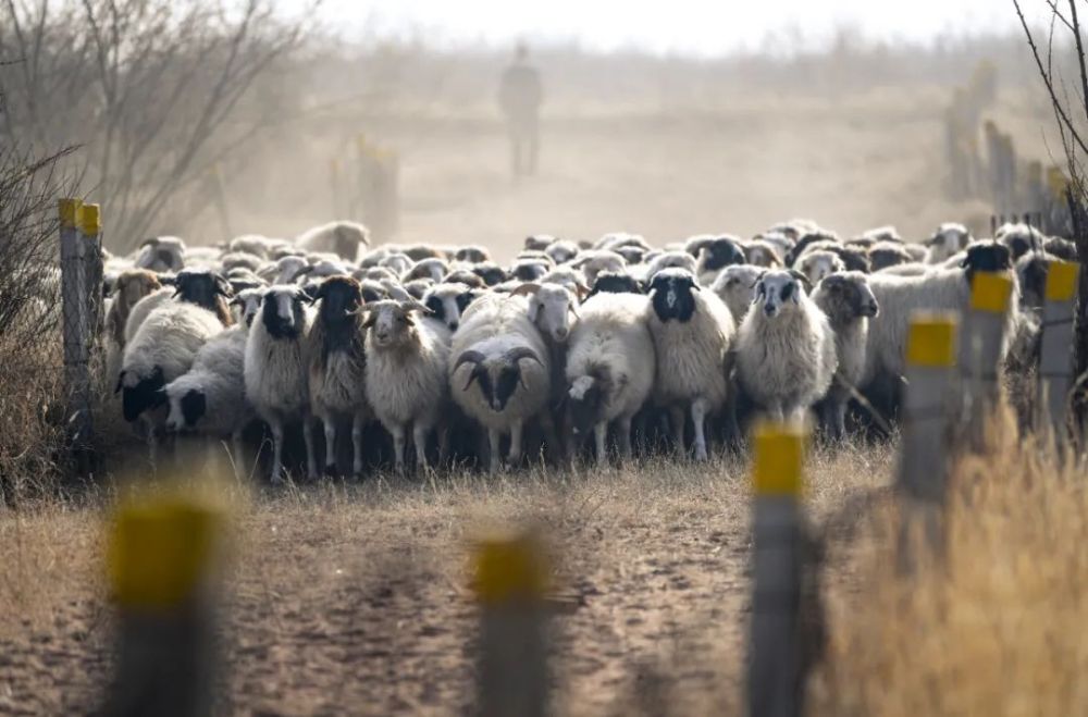 在宁夏盐池县宁鑫生态牧场,工作人员驱赶滩羊在跑道上“跑步”。新华社记者 冯开华 摄