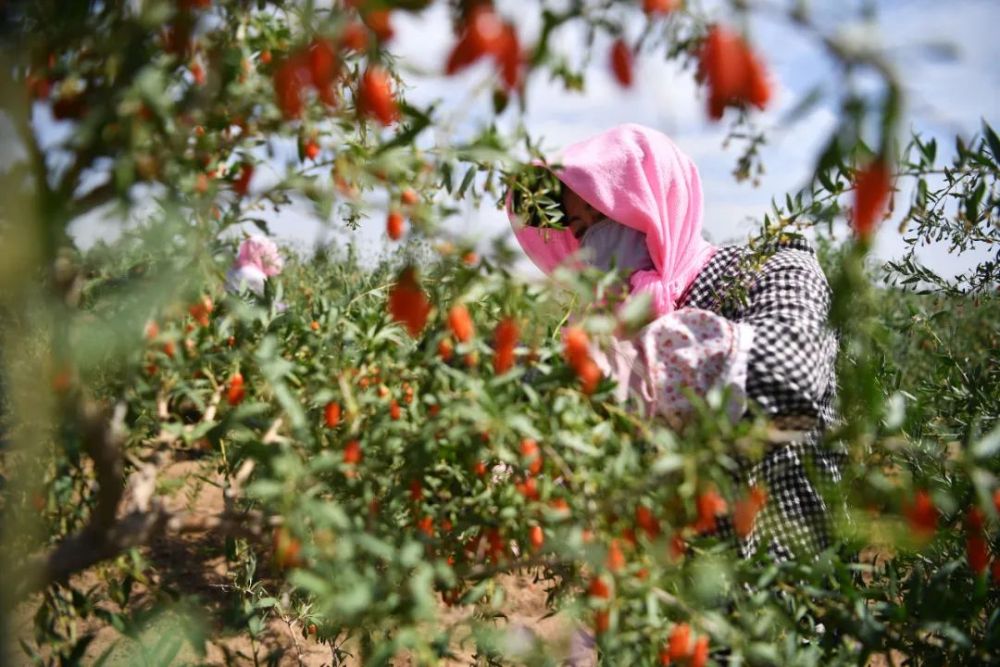 采摘工在宁夏吴忠市红寺堡区百瑞源枸杞种植基地采摘枸杞。新华社记者 王鹏 摄