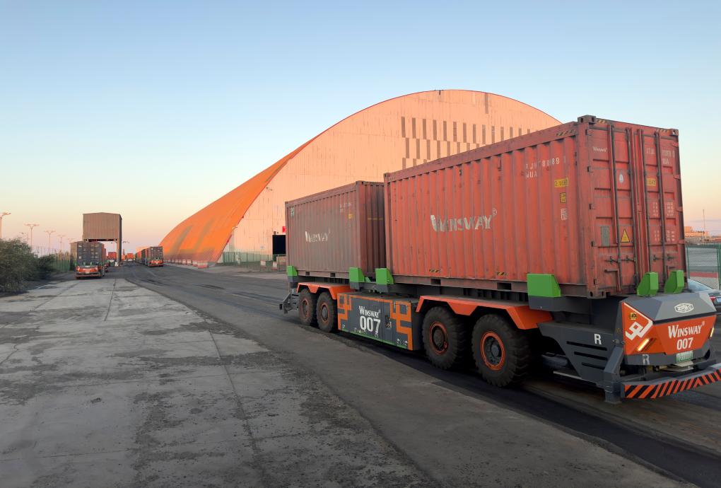 甘其毛都口岸运行AGV无人驾驶车。新华社记者李云平 摄