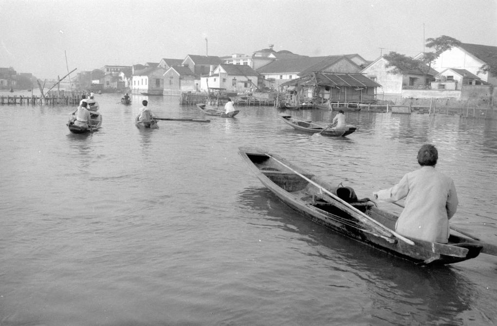 1985年,人们在浙江杭州城外大运河上参与龙舟竞渡。