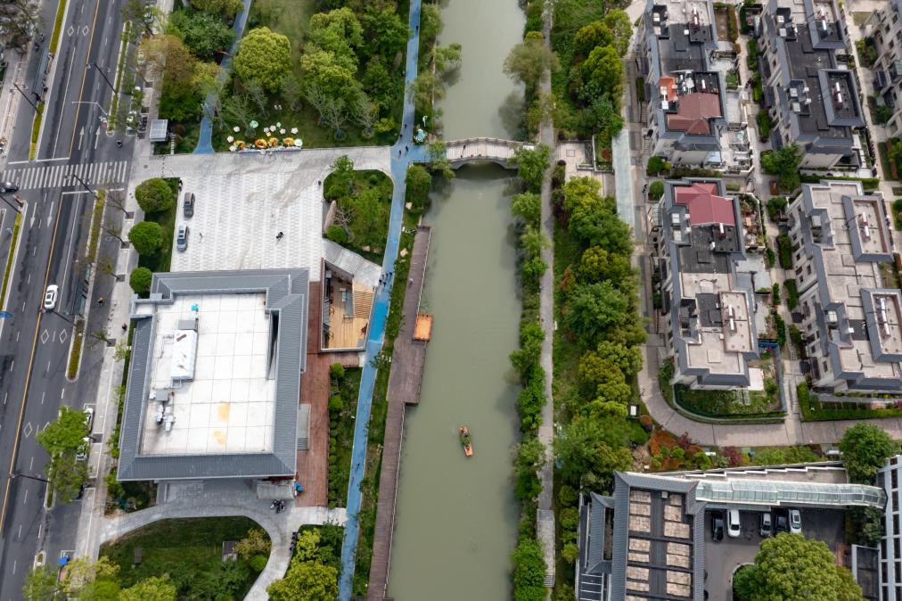 江苏扬州中国大运河博物馆和古运河相映成趣(2023年6月14日摄)。