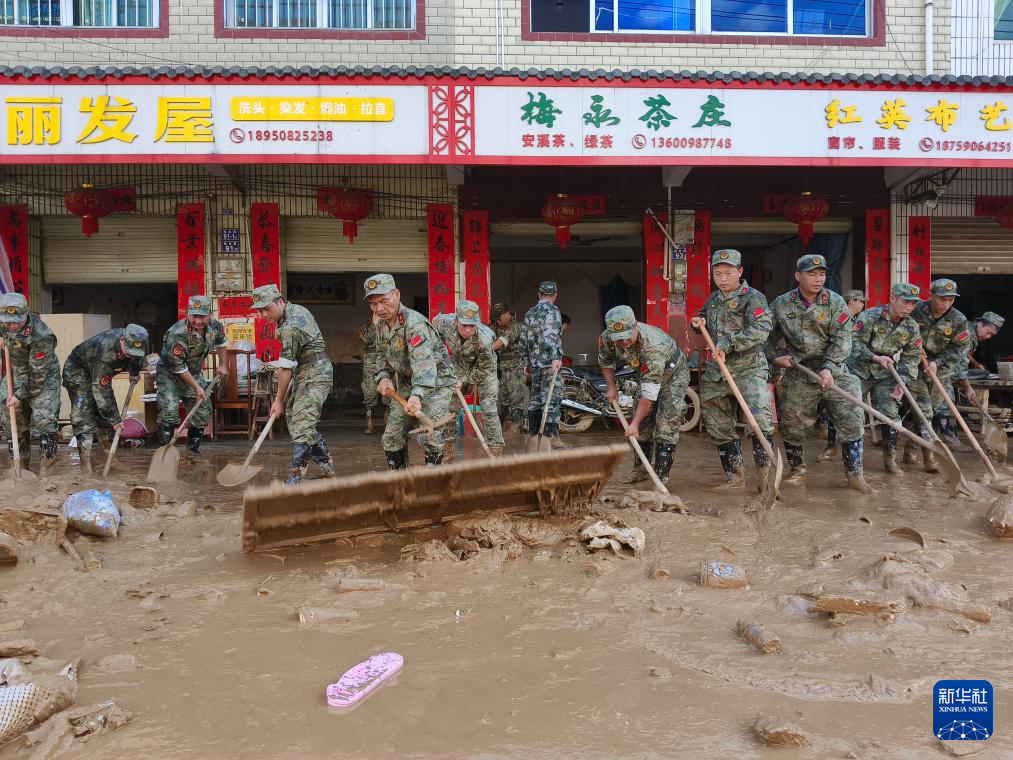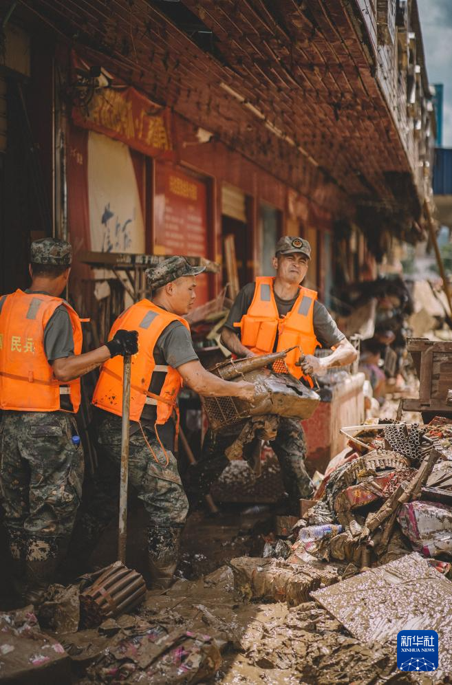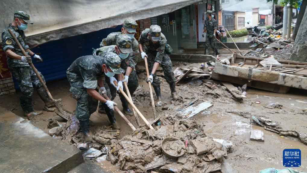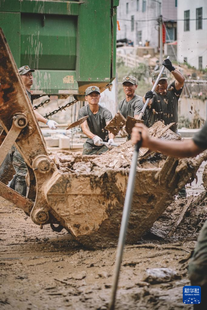 6月20日,福建省军区龙岩军分区民兵在武平县岩前镇清理淤泥。新华社发(李伟君 摄)