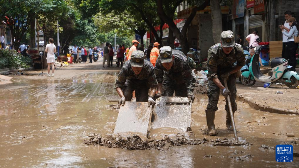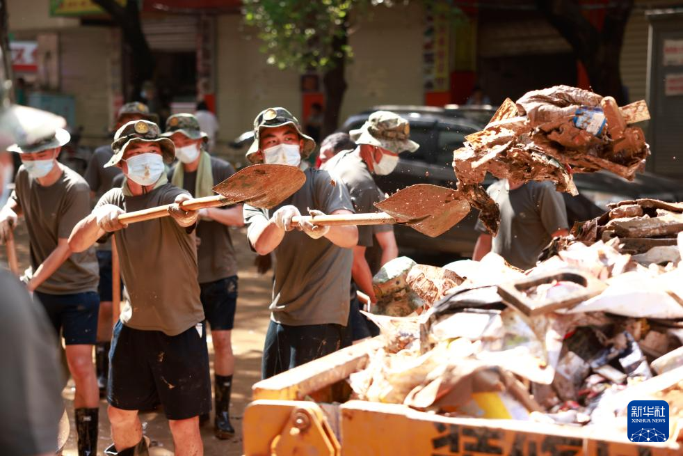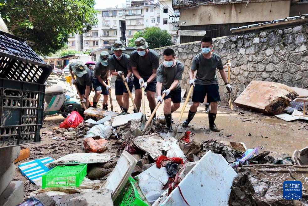 6月21日,桂林联勤保障中心官兵在桂林市象山区象山街道协助地方清除淤泥及杂物。新华社发(姜超林摄)