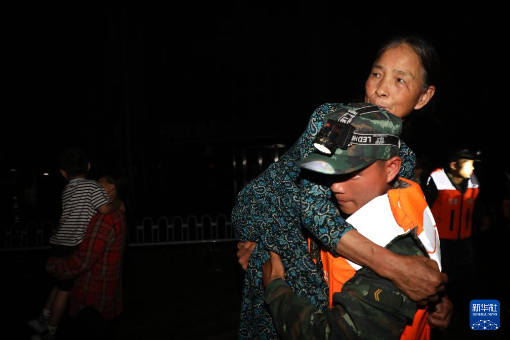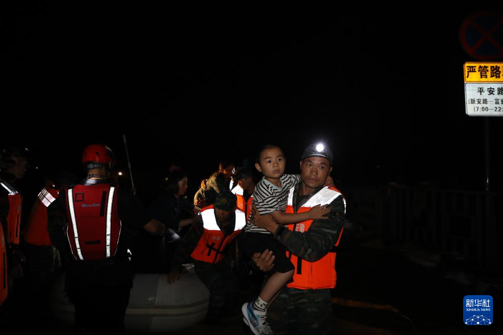 6月20日,武警安徽总队黄山支队官兵在黄山市歙县夜间紧急转移受灾群众。新华社发(刘磊 摄)