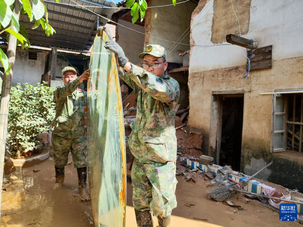 6月20日,福建省军区龙岩军分区民兵在武平县岩前镇帮助受灾群众收拾房屋。新华社发(上官水香 摄)