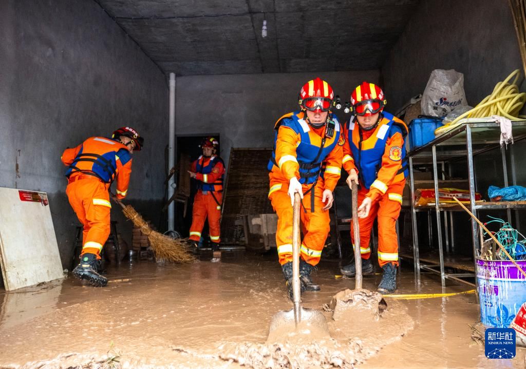6月21日,在重庆市南川区太平场镇桥头社区,南川区应急管理局救援人员在帮助受灾群众清淤。新华社发(甘昊旻 摄)