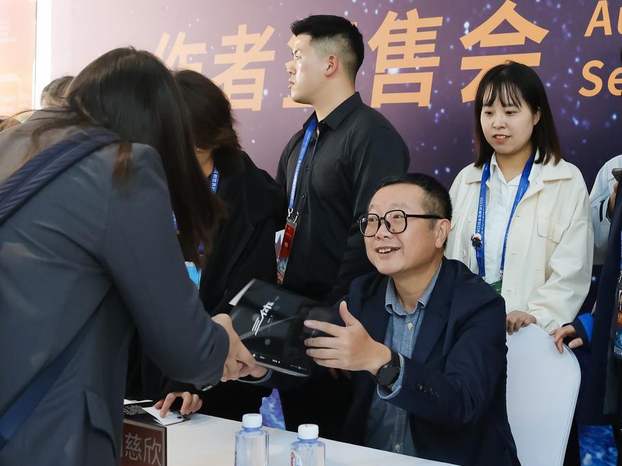 2023年10月20日,刘慈欣(前右)在成都世界科幻大会举行签售活动。新华社记者 沈伯韩 摄