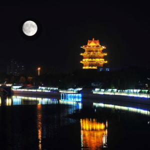 2017年10月4日,在河北省沧州市,月亮与大运河景观带相映生辉(二次曝光)。