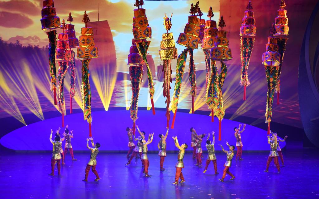 2021年9月28日,演员在第十八届中国吴桥国际杂技艺术节开幕式上表演《俏花旦——集体空竹》。