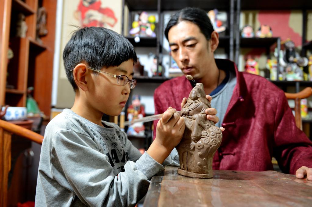 2014年10月22日,“三痴斋”泥塑传承人宋长峰指导儿子进行泥塑制作。