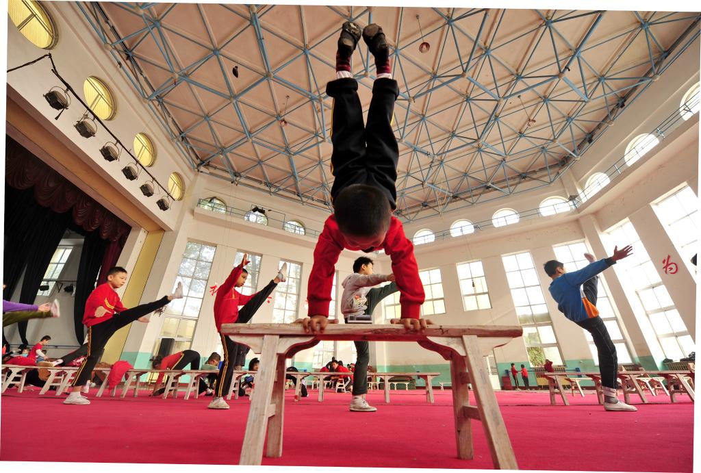 2014年10月24日,吴桥国际杂技艺术学校的学生们在练功。