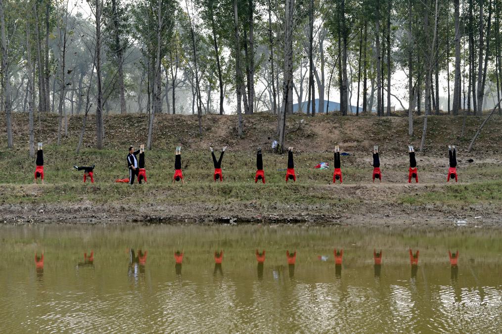 2014年10月24日,吴桥国际杂技艺术学校的学生们在大运河边练功。