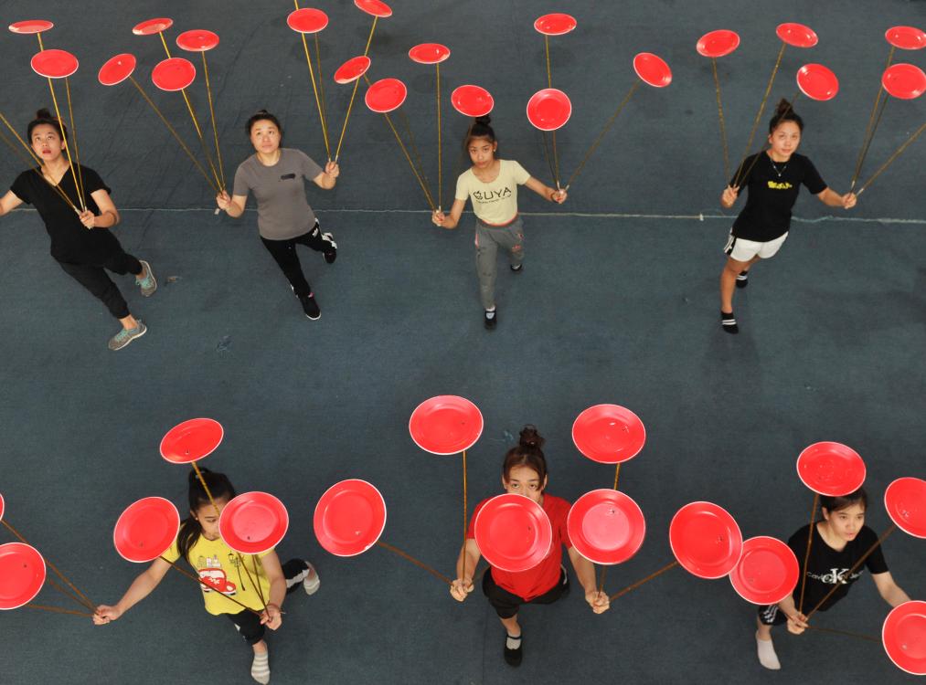 2018年7月30日,来自老挝的留学生们在吴桥杂技艺术学校内练习转碟。