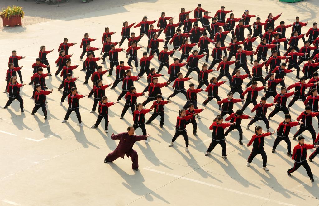 2020年11月19日,六合拳传承人石同鼎(下)在河北沧州泊头西关回民小学带领学生们练习六合拳。