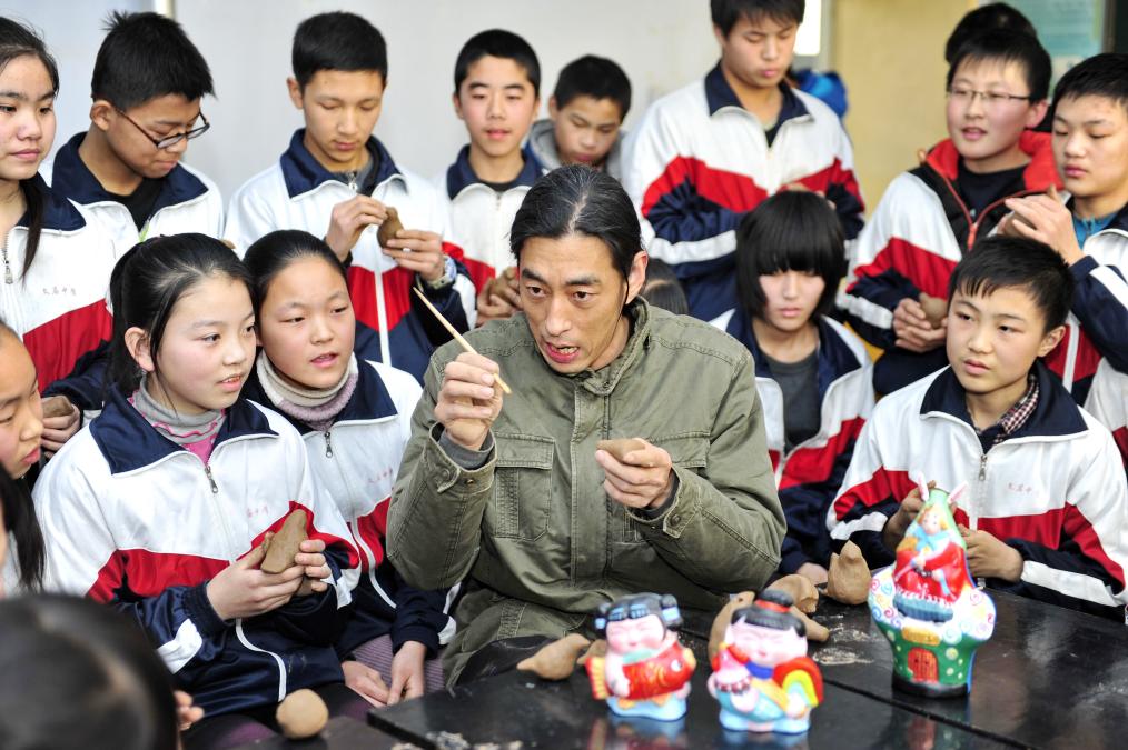2015年1月9日,在河北省泊头市文庙中学,“三痴斋”泥塑传承人宋长峰(前中)在教学生们制作鸟哨。